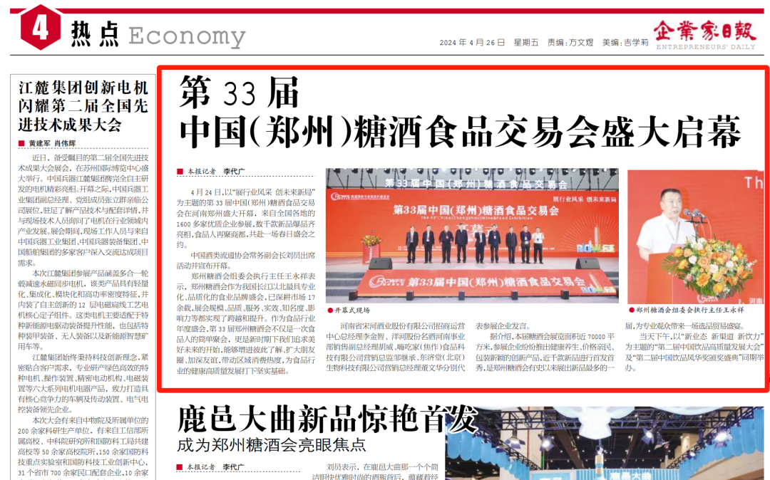 4月26日下午,为期3天的第33届中国(郑州)糖酒食品交易会在郑州国际会展中心圆满闭幕。