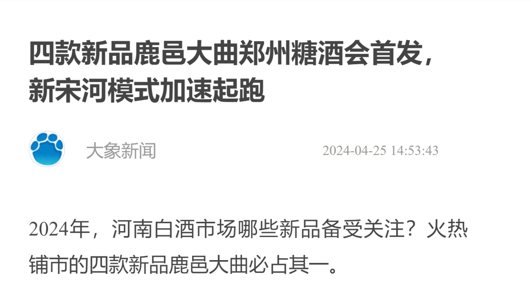 河南省宋河酒业股份有限公司招商运营中心总经理李金智表示,此次参展是鹿邑大曲4款新品的首发首秀,24日产品一经亮相就引发了高度关注,展会前两天,意向经销商和参观商就有400家,确定订单的有160多家。本次参展也是宋河新模式的第一步展现,接下来将继续借助郑州糖酒会,更好展现品牌势能,助力豫酒振兴。