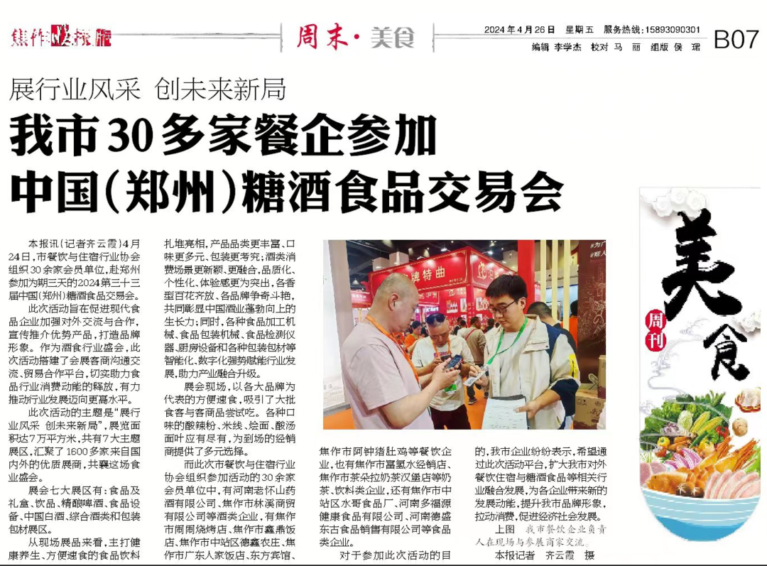 经组委会提前邀约,4月24日,焦作市餐饮与住宿行业协会组织了包括怀山药酒、林溪商贸、鑫鼎饭店、广东人家、东方宾馆、水哥食品厂、多福源、德盛东古等在内的30多家酒类、食品、饮料、餐饮企业,到展会现场参观选品,以期通过郑州糖酒会扩大其对外餐饮住宿与糖酒食品等相关行业融合发展。