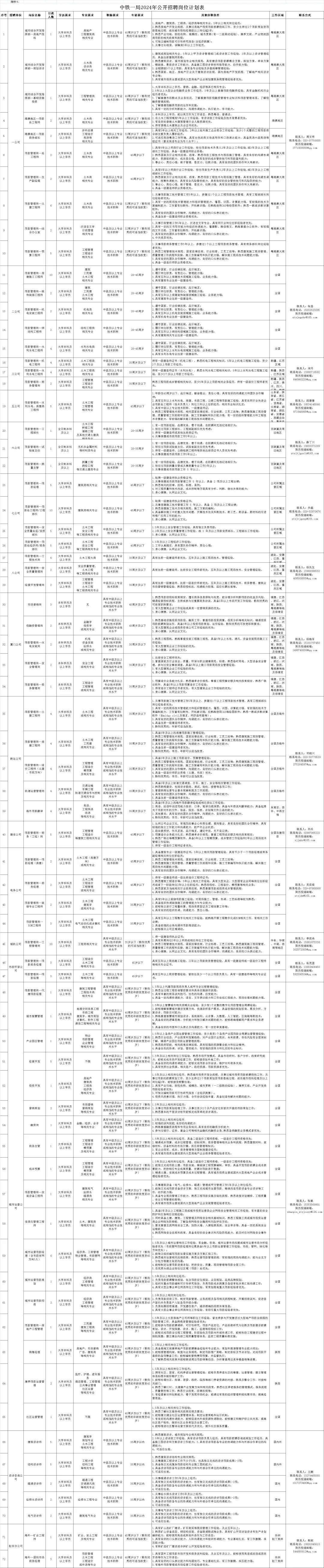 招聘岗位:详见《中铁一局2024年公开招聘岗位计划表》(附件1: