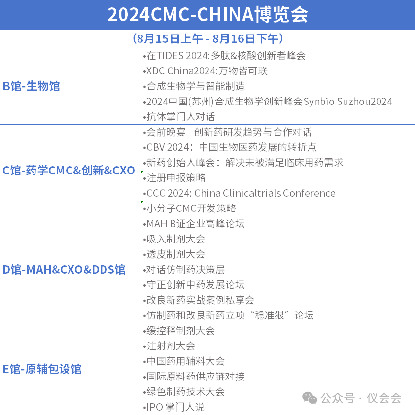 2024年CMC-China博览会设置B、C、D、E四个馆,涉及生物药、小分子创新药、药学CMC&创新&CXO、原辅包主题,涵盖“抗体、多肽&核酸、细胞与基因治疗、XDC、大小分子新药创新、临床试验、MAH、吸入制剂、透皮制剂、中药创新、仿制药和改良新药、缓控释制剂/注射剂、原辅药、绿色制药、合成生物学”等领域达25个论坛。