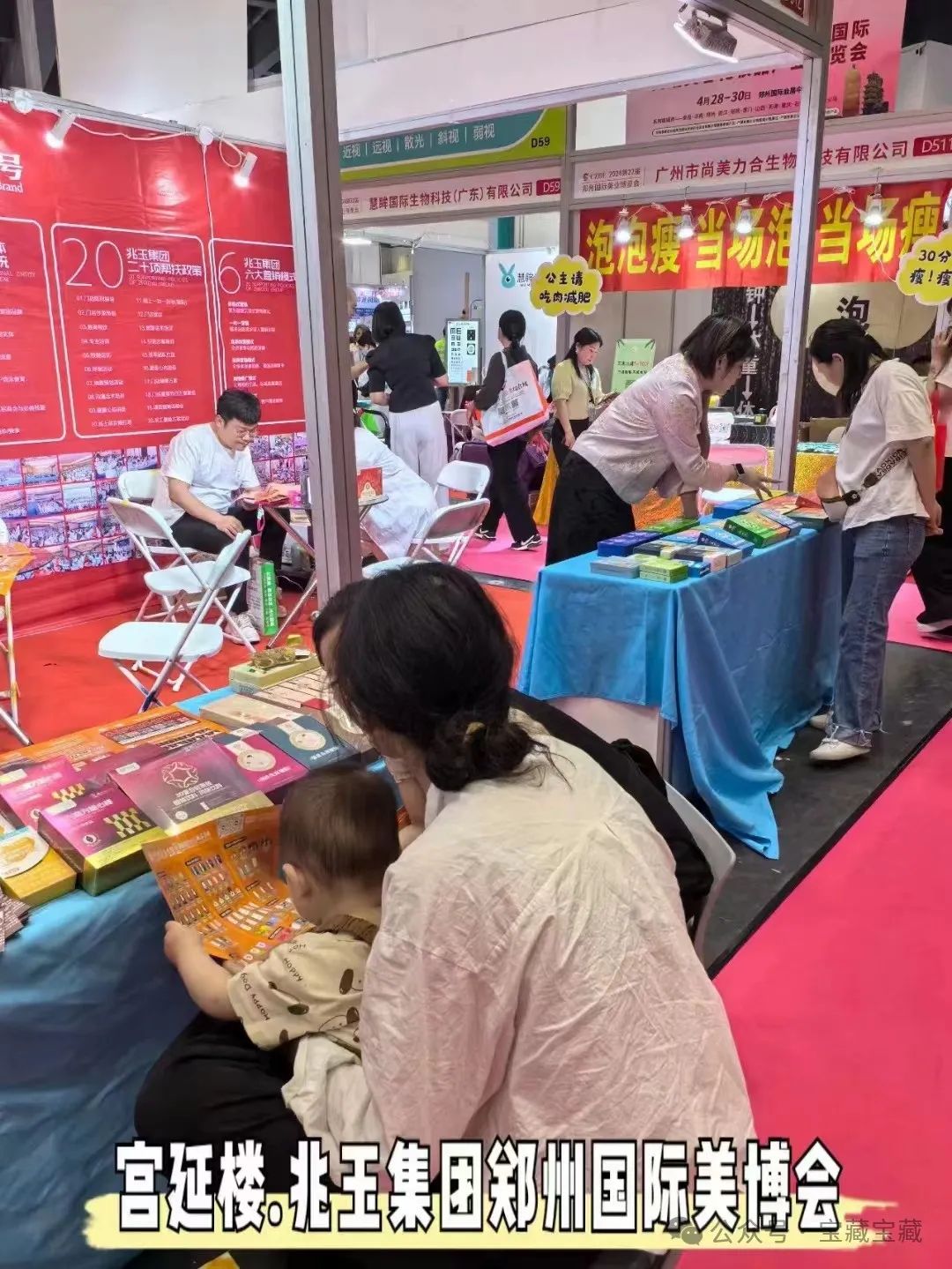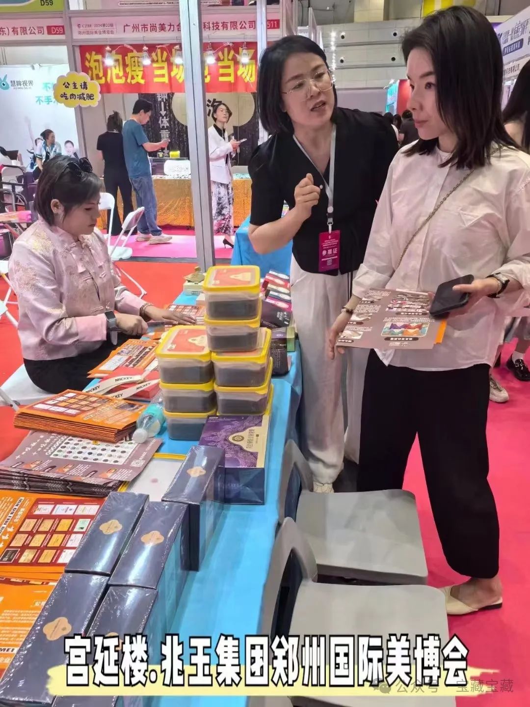 老字号宫延楼是美博会的老选手了,在很多届美博会上,都能看见宫延楼的老字号招牌。当然,招牌底下是宫延楼多个系列的康养产品,蜜膏、热灸膏、瑶浴粉、灸贴、益生菌,数不胜数,现场的观众还能直接体验宫延楼的产品效果。