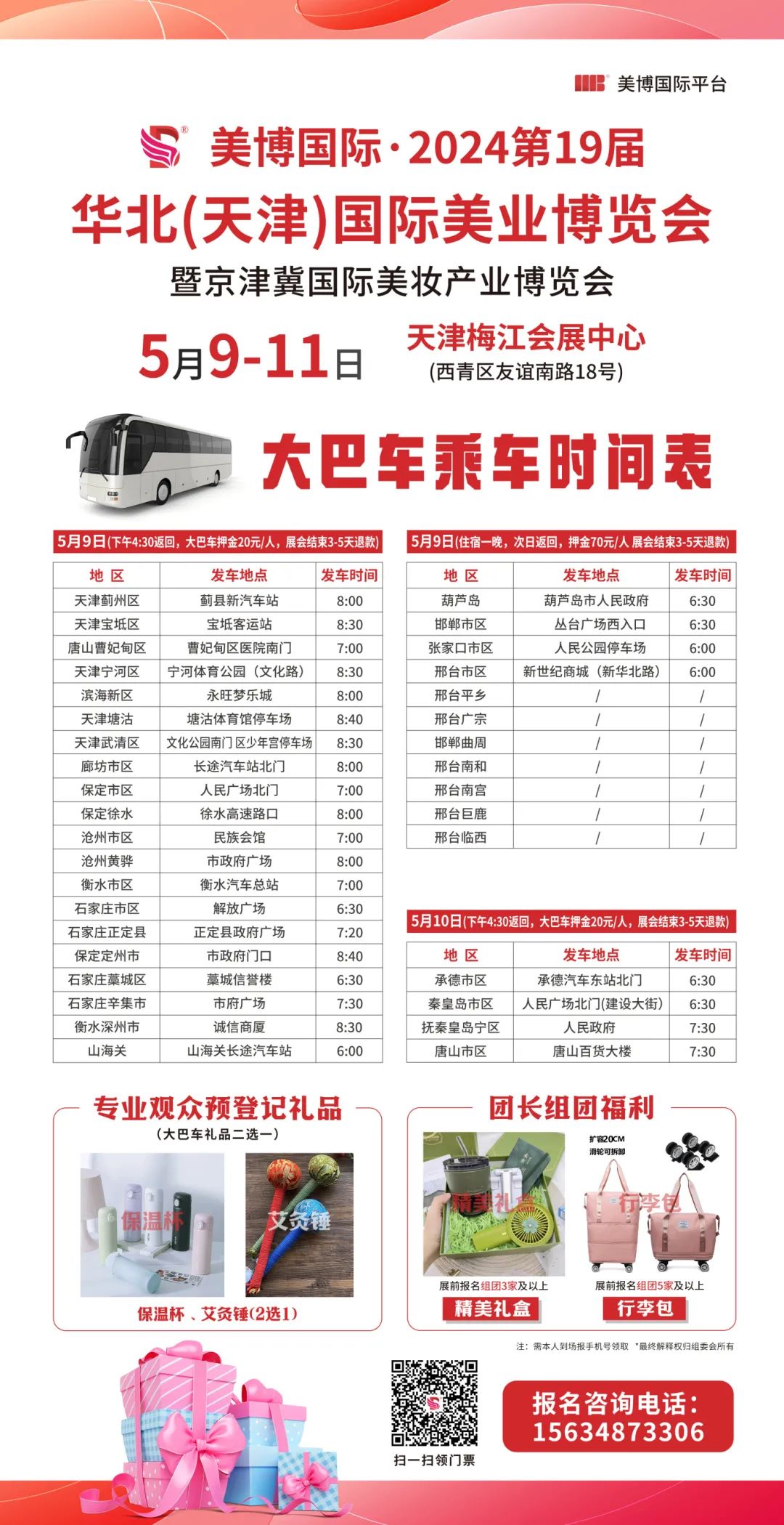 为给各地市买家创造更快捷、更个性化的采购体验,本届天津国际美业博览会『免费大巴车』服务,正式启动预约!以天津为中心辐射京津冀及周边地区,设立免费大巴车乘坐点,助力买家高效到场。