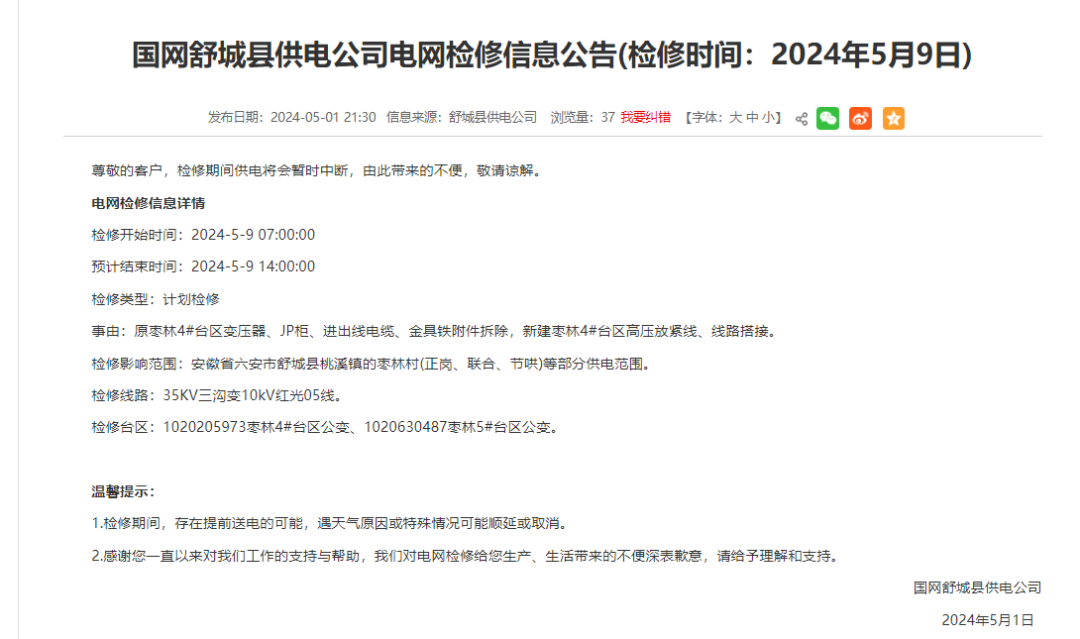 检修影响范围:安徽省六安市舒城县桃溪镇的枣林村(正岗、联合、节哄)等部分供电范围。