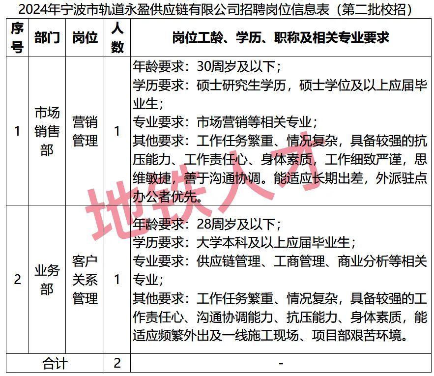 宁波市轨道永盈供应链有限公司为宁波市轨道交通集团有限公司全资子公司,成立于2021年9月,公司注册资本2亿元。公司主营水泥、钢材等大宗物资和轨道交通专用设备销售等业务。因公司发展需要,特招聘以下岗位人员(详见附件)。