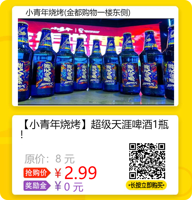 【小青年烧烤】2.99抢超级天涯啤酒1瓶!