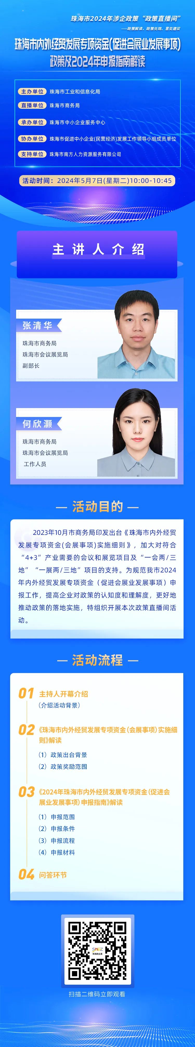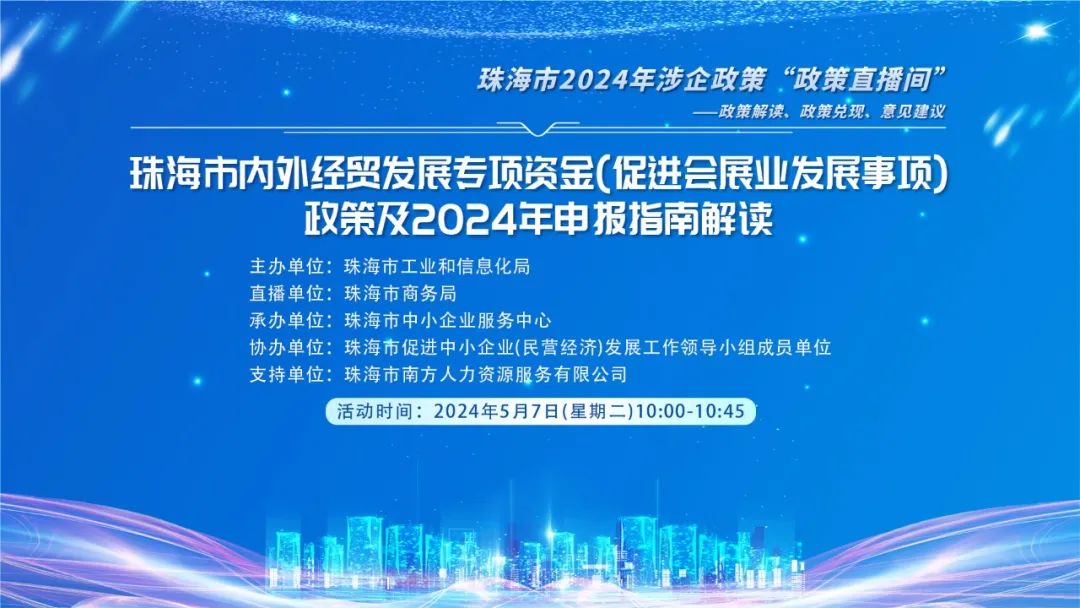 为规范我市2024年内外经贸发展专项资金(促进会展业发展事项)申报工作,提高企业对政策的认知度和理解度,更好地推动政策的落地实施,珠海市商务局相关业务负责人将于5月7日在【政策直播间】,线上讲解相关政策及申报。