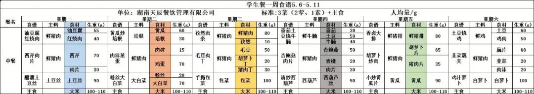 为进一步落实上级文件精神,加强学校配餐管理,确保学生营养均衡,提高学生就餐质量,现将长塘里阳光小学选用的湖南天辰餐饮有限公司一周菜谱带量进行公示,欢迎广大师生、家长提出宝贵意见。