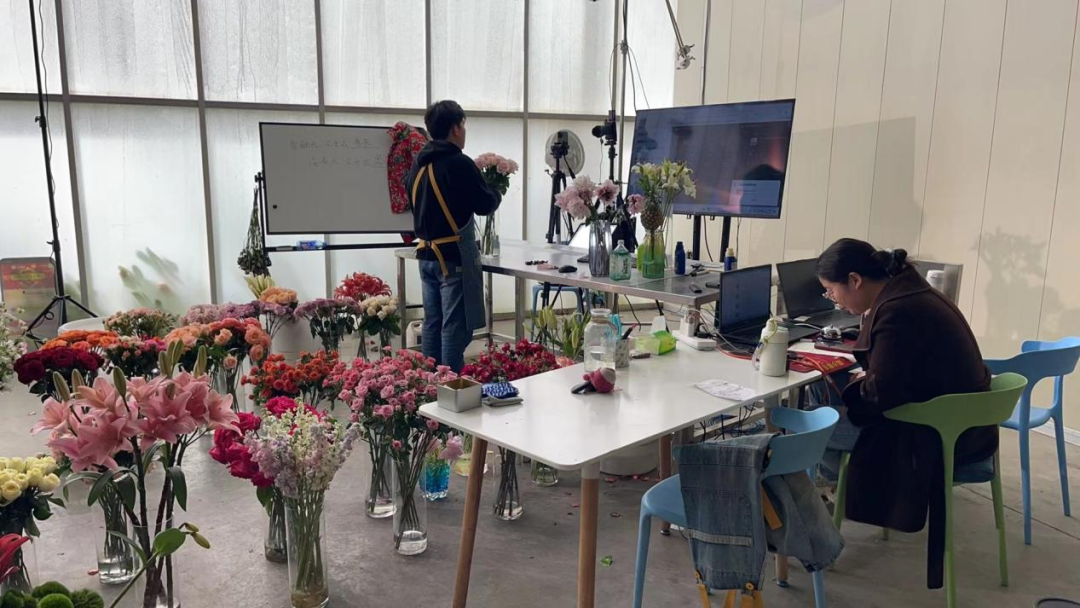 大家来到了智能温室鲜切花直播间,主播面前摆放着几套直播设备,“欢迎宝子们来到直播间,大家现在看到的玫瑰花都是我们农投自产的。”主播热情地向粉丝打招呼,负责电商的经理告诉大家:“在智能温室这样的环境下去做直播介绍会更直观、更有说服力,这几名主播都是公司自己的员工,经过培训后上岗的,每天约有上千个订单在这里成交。”