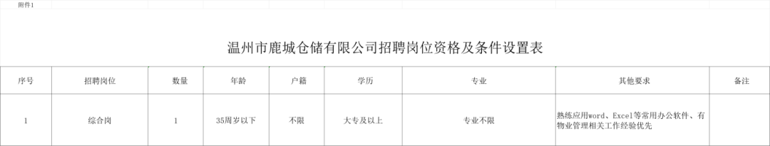 附件:1、《温州市鹿城仓储有限公司招聘岗位资格及条件设置表》