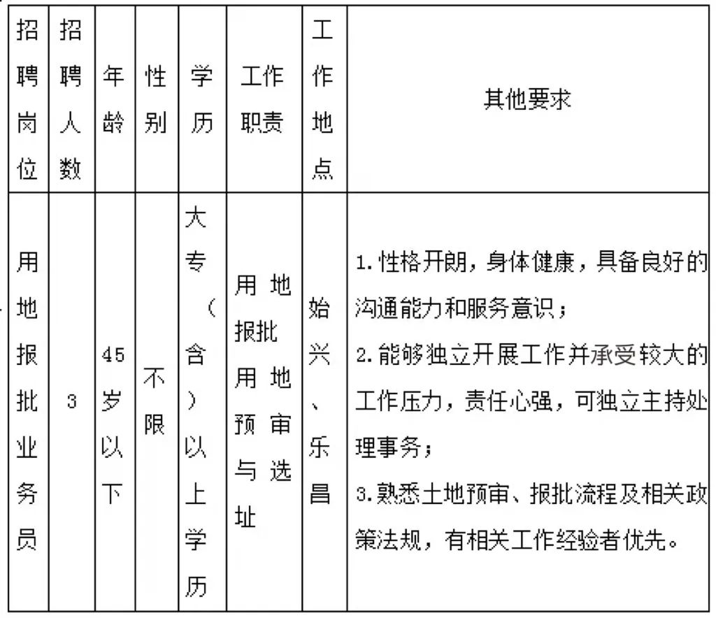 根据工作需要,我公司现公开招聘用地报批业务员3人,派遣至韶关市规划市政设计研究院有限公司工作。有意者可携本人身份证和相关证件的原件及复印件到韶关市粤凯人力资源服务有限公司报名,经审核后,通知符合条件者参加考试,择优录取。现将有关事项公告如下: