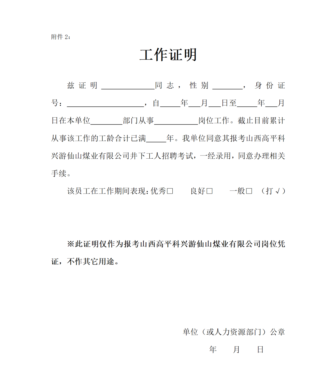 1.《山西高平科兴游仙山煤业有限公司井下工人招聘报名表》(见附件1)
