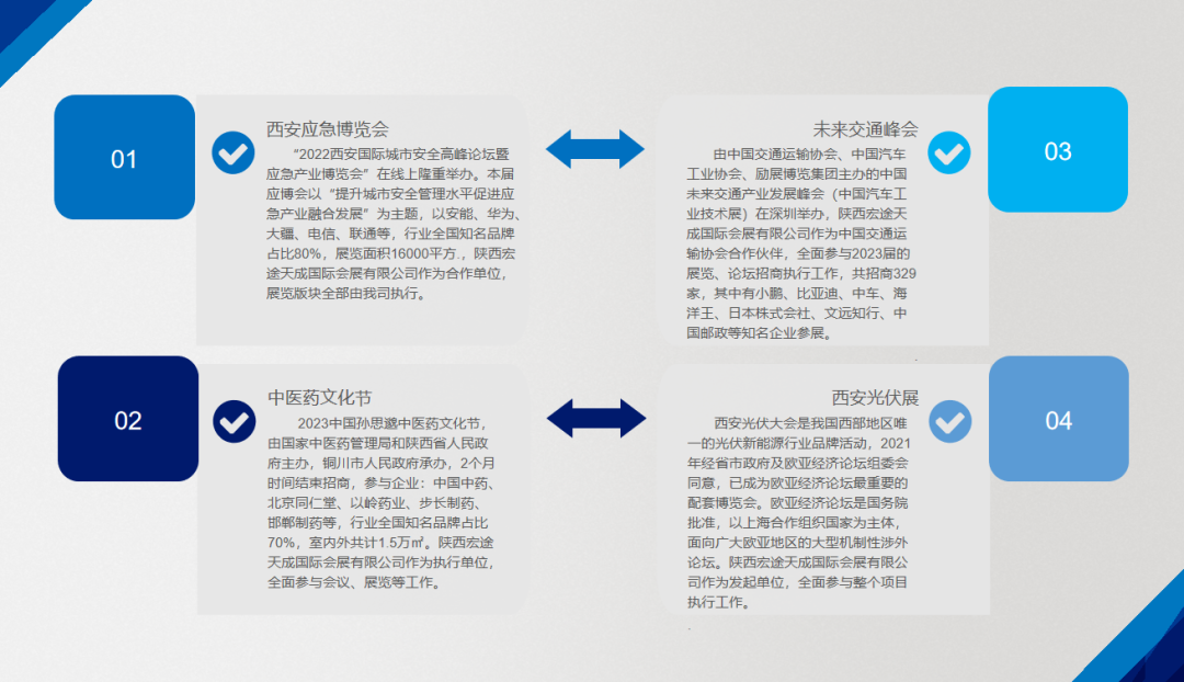 陕西宏途天成国际会展有限公司自成立以来,专注于从事国际、国内会议展览、展台搭建和节庆赛事策划、组织、运营的专业会展公司。公司拥有高素质的管理团队、优秀的策划团队、具有高效执行力和丰富会展经验的市场招商团队。自成立以来始终紧密结合国家战略、围绕中省市最新政策,结合当地产业发展布局,大力培育自身的会展品牌,不断创新会展服务模式。