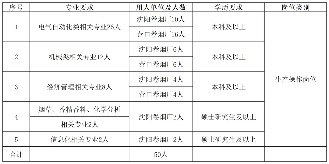 本次招聘计划50人,均为生产一线操作岗位,招聘单位、人数、学历、专业要求详见下表: