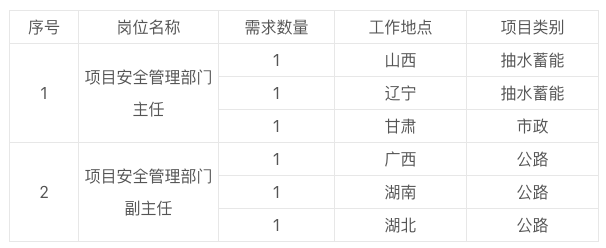 1.思想政治素质高。具有履行职责所需要的政治理论,政治立场坚定,讲学习、讲政治,求真务实,同时高度认同公司企业文化及理念。遵纪守法,无违法违规违纪行为记录。2.专业能力素质强。具有履行岗位职责所必备的专业知识和能力,具有较强的沟通协调能力、组织实施能力。3.工作业绩较突出。能够满足应聘岗位的任职要求,同时具有强烈的事业心和责任感。4.具有全日制大学专科及以上初始学历,所学专业为工程类相关专业,安全工程、水利水电、铁路、市政、公路等相关专业优先,持有注册安全工程师证书者优先。5.年龄不超过45周岁,身心健康,具有胜任岗位的身体条件。6.应聘项目安全管理部门主任岗位应具有5年及以上工程项目现场安全管理经验,同时具备中级及以上职称;应聘项目安全管理部门副主任岗位应具有3年及以上工程项目现场安全管理经验。1.贯彻落实国家安全生产法律法规、行业规范、上级安全生产决策部署,遵守本单位各项安全管理制度。2.按照行业、上级及公司要求,组织开展安全生产标准化、信息化建设,落实各项安全生产管控措施,推动安全文化建设,提升全员安全素质,预防生产安全事故发生。3.组织编写项目安全策划,制定年度工作计划,明确年度安全生产目标和保障措施。4.组织拟定安全生产规章制度和人员安全操作规程,组织实施并监督检查执行情况。5.组织开展安全风险识别、评价工作,落实安全风险各项管控措施。6.组织开展安全生产监督检查,督促落实安全隐患整改工作。7.组织开展安全教育培训,严格三级安全教育、违章再教育和转岗、返岗培训。8.规范安全生产费用管理,确保安全投入足额、及时、规范、有效。9.负责应急管理工作,组织编制应急预案,开展应急演练和应急能力建设评估,妥善处置各类突发事件。2.组织或参加安全教育培训、安全活动、安全会议、应急演练及应急救援工作。3.协助部门负责人组织拟定安全生产规章制度,组织制定本部门的安全职责。4.负责施工现场的隐患排查治理工作并督促落实整改。5.及时组织对新进场人员进行三级教育培训,安全交底, 并定期开展专项培训。6.协助部门负责人组织编制项目应急预案,开展应急演练和应急能力建设评估,妥善处置各类突发事件。7.参加安全事故调查处理,制定落实纠正和改进措施。填写《社会成熟人才基本情况登记表》(附件1)、《应聘人员基本情况汇总表》(附件2)发送指定邮箱:存在以下情形之一的,不予接受应聘:受过刑事处罚或正在接受纪检、监察部门或司法机关立案审查的;受党纪、行政处分或组织处理,影响期未满的;纳入失信被执行人名单的。1.薪酬福利:提供具有绝对市场竞争力的薪酬,可按照公司薪酬制度执行,也可实行年度协议薪酬,具体面议。2.全面、人性化的社会保险制度:包括“八险两金”及多项职工福利。联系电话:0717-6714641,0717-6719981Email:cggc1_aqb@ceec.net.cn