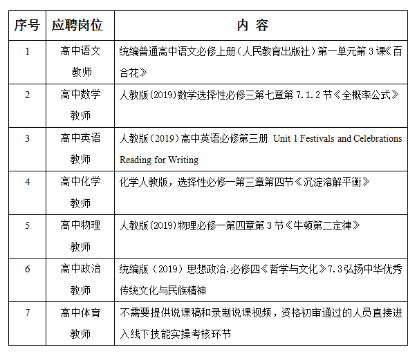 2.说课稿提交:提交说课视频时,同时提交说课稿,以“应聘岗位+姓名+说课课题”命名发送到邮箱:1261632251@qq.com。逾期未发,将视为自动放弃,重复提交者以第一个说课稿为准。