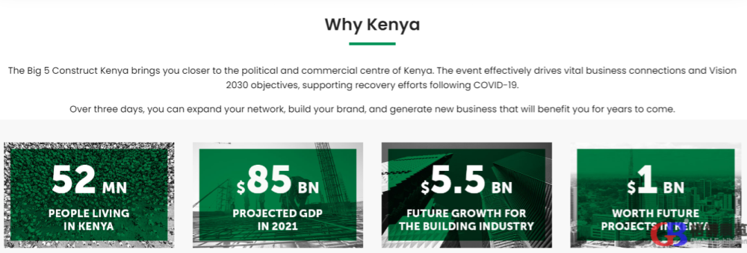 肯尼亚内罗毕五大行业展览会(Big 5 Construct Kenya)是全球三大建材展big5系列展之一。自2016年首届举办以来,每年一届。展会是由主办方DMG EVENTS展览公司主办, 公司总部位于阿联酋迪拜,自1989年开始在沙特阿拉伯,新加坡,加拿大,南非和英国开展业务,是一家国际性的展览和出版公司。每年吸引超过350,000名参观者参加80个展览。