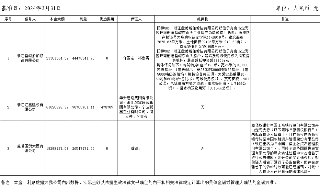我分公司拥有对浙江盘峙船舶修造有限公司等三户不良债权及从权利。截至2024年3月31日,上述三户债权本金余额102699820.42元,利息161731575.03元,代垫费用478709.00元,债权详细情况如下: