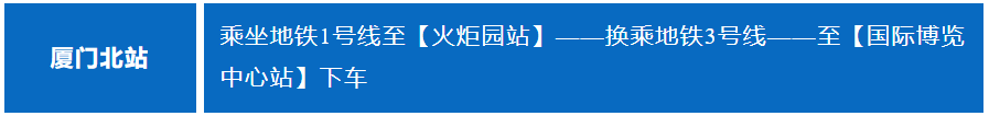 厦门站-厦门国际博览中心约22公里,导航至“厦门国际博览中心”即可抵达。