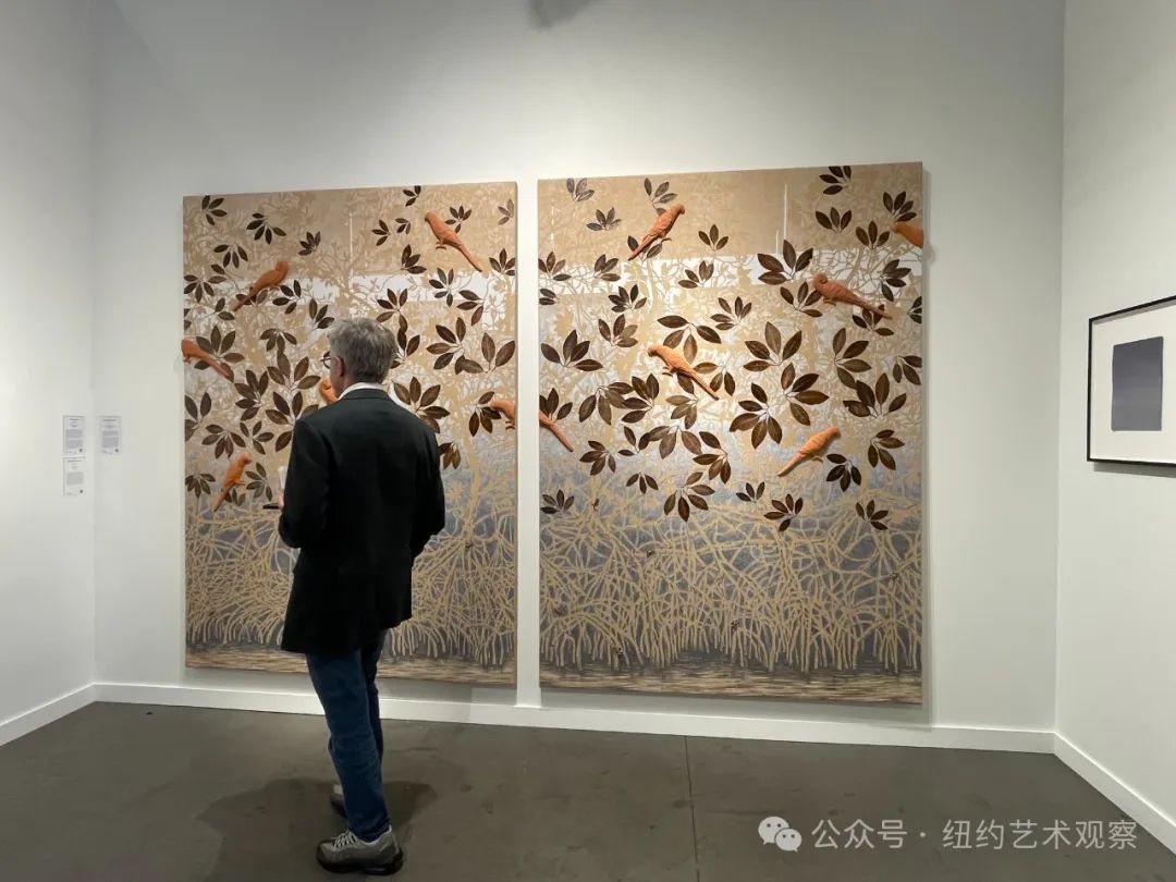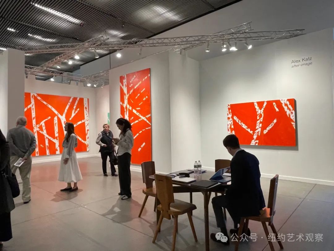 二楼第一个展厅,是Gladstone画廊带来阿历克兹·卡茨(Alex Katz)的一批风景画新作品,主题是树,色彩也是块的橙色,非常引人注目,Katz今年已经是97岁高龄,每天还在曼哈顿的画室里画画,只是从前最擅长的人物题材作品已经比较少见。