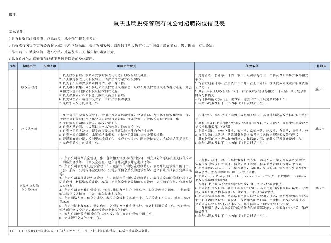 任职资格条件及主要岗位职责详见附件1《四联投资招聘岗位信息表》。
