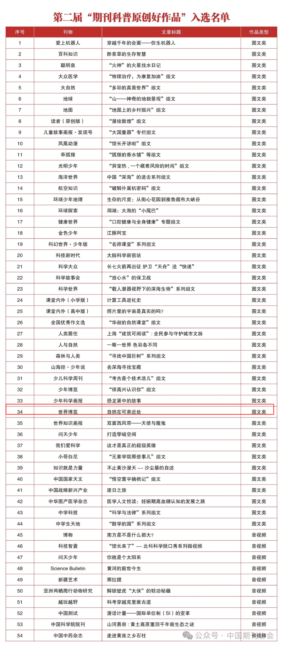 其中,《世界博览》文章《自然在可亲近处》入选“期刊科普原创好作品”榜单。