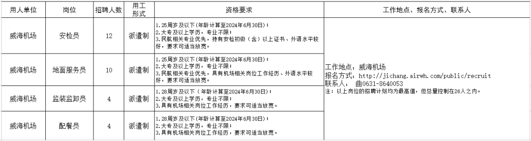 本次招聘涉及安检、地面服务、监装监卸、配餐等4个岗位共30人。