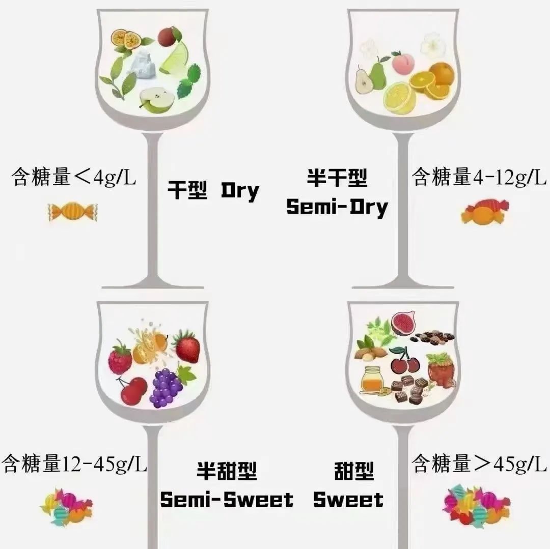 首先我们得知道一个术语——剩余糖分 俗称:糖残留。我们知道,在发酵过程中,酵母会把糖分转化为酒精。而在发酵完成后,成酒中没被酵母转化成酒精的残留下来的糖分就是剩余糖分。一般以每升葡萄酒中含有多少克糖(g/L)来表示。“干”型就是指剩余糖分大概的一个指标,并不是字面意思“没有水分”。