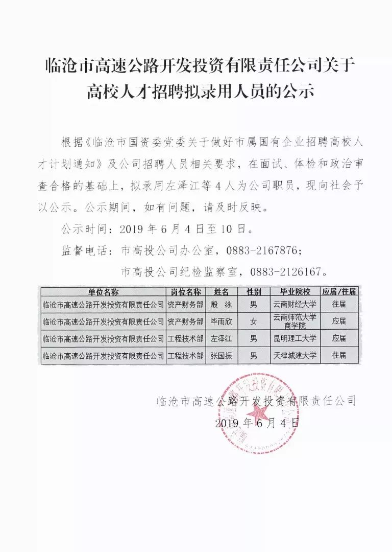 公示 | 临沧市高速公路开发投资有限责任公司关于高校人才招聘拟录用人员的公示