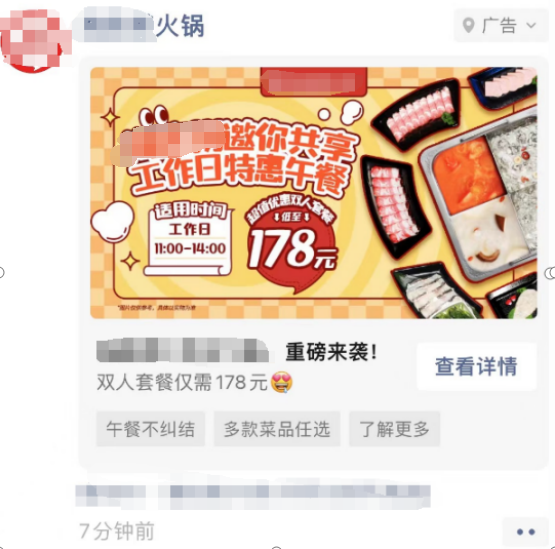 使用简短、有力、易于理解的词汇和短语,介绍简单,强调午餐不纠结,多款菜品任选,了解更多,并且其中还有优惠活动,使观者更加有兴趣点击进去。