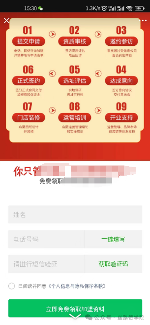 在落地页上提供一键填写或电话拨打(如下图),图片中一键填写,方便用户快速完成目的。想做餐饮招商加盟或者是想了解的可以很快的获得商家的联系。