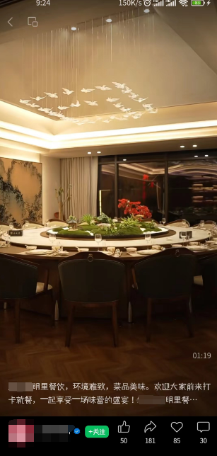 使用高清、美观的镜头,展示菜品的外观、质感和制作过程,或者展示餐厅的环境(如下图),图片中展示了非常浓厚的餐厅氛围,不管是餐厅设计还是茶饮接待都突出了非常高级的视觉,吸引观众的眼球。