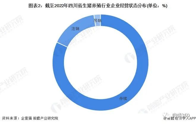 根据中国企业数据库企查猫,目前四川省生猪养殖行业的存续企业2264家,占总企业数的82%;注销企业439家,占比为16%,吊销企业数量占总企业数量的2%。整体来看,四川省生猪养殖行业存续企业数量占比超80%,行业发展较为健康。