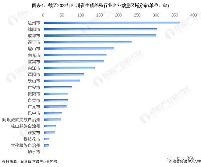 从生猪养殖企业区域分布情况来看,目前四川省生猪养殖行业企业主要分布在达州、绵阳和成都,截至2022年12月28日,达州市共有生猪养殖行业企业361家、绵阳市共有生猪养殖行业企业301家、成都共有生猪养殖行业企业299家。