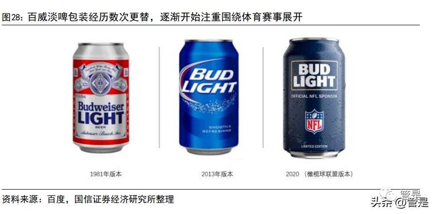 乌苏借助自媒体传播爆火出圈后,凭借话题性吸引了大批消费者购买尝试,实现销量的快速增长。那么如果品牌的话题性消失,网红热度消退后,动销增长会不会难以为继成为市场关注的第二大要点。我们认为乌苏品牌即品类,将由网红向长红品牌蜕变。乌苏在经过近几年各式线上线下活动宣传的烘托下,凭借新疆名片的身份与烧烤摊羊肉串的饮食场景高度适配,“夺命”属性被消费者所认可成为衡量酒量的标准之一,所建立起的极致硬核属性已经深入人心。尽管其他品牌亦推出了一些口感相近的产品试图切入市场,但竞品品牌在文化底蕴以及消费者认知上有明显差距,无论在产品“夺命”属性的打造上还是与新疆烤串场景的适配度都无法形成有效替代。消费习惯养成后乌苏品牌在烧烤及豪饮拼酒场景形成有效卡位,配合终端陈列的持续曝光将完成从网红向长红的转变。借鉴海外成功品牌,绑定特定场景为占领心智形成品牌认知的关键。米勒(Miller)啤酒于 1970 年推出的淡啤迅速占领了美国市场,巅峰期市场占有率一度达到 20%以上。百威观察到消费者在消费习惯上的变化趋势,消费场景由酒吧逐渐迁移至家中,居家观看体育赛事演变成为消费者的高频饮酒场景;于是作为后进入淡啤市场的挑战者,百威开始大举赞助体育赛事,包括美国橄榄球联盟、职业棒球联盟、NBA 等,一方面加大品牌曝光率,另一方面在心智上进行卡位,将品牌和观看体育赛事场景进行绑定,实现了销量的后来居上。绑定观看体育赛事场景的做法延续至今,帮助百威淡啤坐稳美国销量第一的位置。