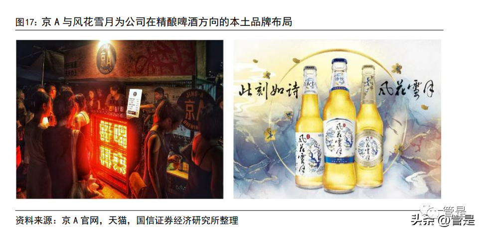 本土品牌之重庆、大理与西夏:区域性优势品牌,深耕基地市场。重庆啤酒品牌深耕川渝湘地区,大理啤酒为云南区域优势品牌,西夏啤酒在宁夏地区深受当地消费者喜爱。经过多年的品牌运作与消费者培育,这类本土品牌在各自区域市场已积累起较高的品牌认可度,市占率均超 50%。本土品牌之风花雪月与京 A:精酿啤酒方向上的本土品牌布局,定位中、高端。风花雪月基于其花香口味,和浪漫、引人遐想的云南产地,搭配清新的包装主打女性聚会及谈情说爱的场景,在云南市场具有一定的市场占有率。京A 为本土手工精酿啤酒品牌,于 2019 年获嘉士伯入股,作为集团在高端手工精酿领域押注布局的啤酒品牌,主打高端餐吧针对口味挑剔的啤酒深度爱好者,具有良好的口碑。