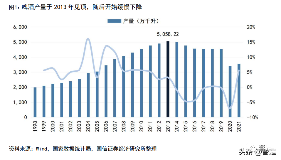 1.1.1 我国啤酒产量已于 2013 年见顶,适龄饮酒人口下降和人均啤酒饮用量稳定决定我国啤酒行业销量见顶。