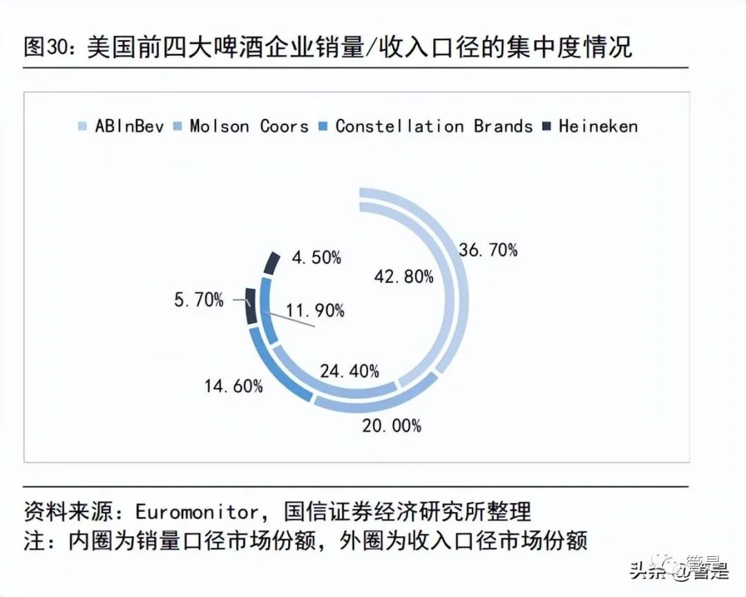 美国啤酒的格局印证了,主流品牌均有机会在高端啤酒的竞争中争得一席之地。参考美国成熟市场,在已形成双寡头垄断的竞争格局下,我们看到龙三龙四仍有10%左右的市场份额,且收入口径的市场份额较销量口径的市场份额明显更高,啤酒结构更偏向高端。因此我们判断龙头企业通过低端啤酒销量建立的优势在高端啤酒竞争中不能完全复用,啤酒其余主流品牌在面对双寡头的相对竞争优势压制下,在高端啤酒市场中仍能寻求有效突破,高端市占率高于整体销量的市场份额。相比美国成熟市场格局来看,中国啤酒市场竞争格局相对更加分散,我国啤酒龙头企业相较于美国啤酒双寡头来说在行业内的相对优势更不明显,因此在我国高端啤酒市场竞争中,其他主流品牌有更大的发展空间。我们判断龙头企业凭借对渠道、优势区域的封锁运营,已建立起竞争壁垒,未来前五大龙头企业的市场占有率在排名上可能难以发生颠覆性变化。但参照美国情况来看,高端啤酒无论在消费场景还是消费目标人群上都与中低档啤酒存在区隔,领军品牌凭借中低档啤酒销量实现的身位优势无法在高档啤酒上形成绝对的卡位。