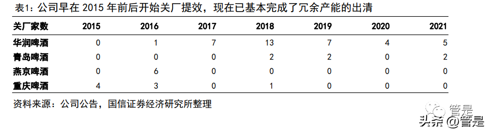 由于产品重量大单价低的特性所致,啤酒不适于长途运输,运输半径一般不超过500KM,因此啤酒企业大多采取销地产的模式进行经营运作。产能的合理布局将更加有效地支撑市场销售活动与运营,并有效节约运输成本。在产能过剩,行业产能出现大量冗余的背景下,公司自2015 年起,针对已有的冗余产能进行梳理与重新规划。通过关闭生产设备老化,产能利用率低下的工厂,完成了全国范围内的产能优化,轻装上阵。留存下来的工厂经过对生产工艺的打磨优化,效率稳步攀升。