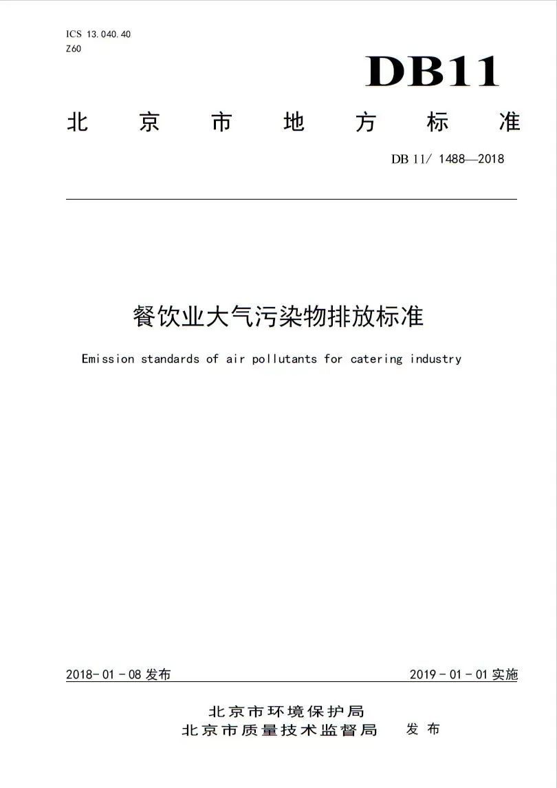 北京市《餐饮业大气污染物排放标准》(DB11/1488-2018)规定,未经任何净化设备净化排放油烟的餐饮服务单位视同超标排放,同时《标准》要求餐饮服务单位排口处油烟、颗粒物和非甲烷总烃的最高允许排放浓度不超过1、5和10 mg/m³;