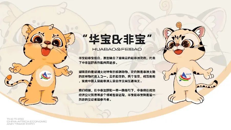“华宝和非宝的原型融合了湖南云豹和非洲花豹的形象。”中非经贸博览会相关负责人介绍,湖南云豹是湖湘大地特有的珍稀动物,非洲花豹则是非洲大陆的代表动物之一。