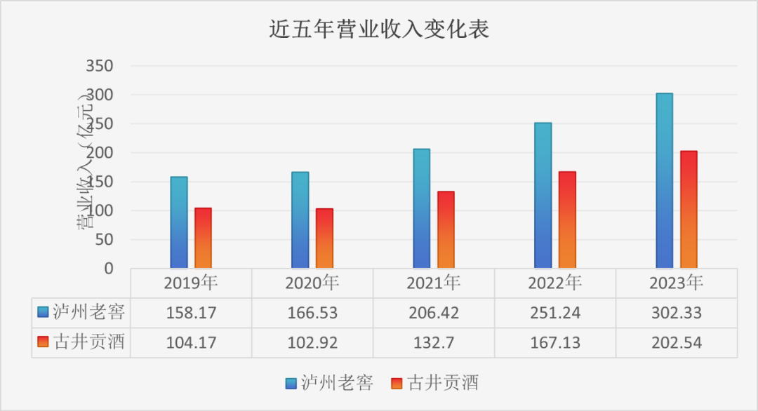 三年前的古井贡酒还仅仅只有一百亿,如今一跃加入了“200亿俱乐部”。古井贡酒正在加速甩开对手,逐渐向第二梯队的选手们逼近。“200亿俱乐部”对于白酒企业具有里程碑式的意义,不少酒企都曾在百亿级出现回调趋势,古井贡酒算是在千军万马的白酒行业当中杀出了重围。对于泸州老窖来说,这是一个巨大的威胁。一个是来自安徽的名酒,一个是四川人的骄傲;一个醇厚悠长,一个口感清爽,无疑都是浓香型白酒的绝佳选品。但一路狂飙的古井贡酒现在还不能乐观。年报数据显示,两者在营收上的数据在不断拉大。如下图所示,泸州老窖和古井贡酒的营业收入差距从2019年的54亿元,到2020年的63.61亿、2021年的73.72亿、2022年的84.11亿元,更是在2023年度达到了接近100亿元的差距。营收看来,泸州老窖似乎把古井贡酒“甩的”越来越远。营收表现的背后,两者的差距不止于此。从毛利率来看,泸州老窖的成本控制良好,中高端酒毛利率提升至92.27%,已经逼近茅台酒94.12%的毛利率。2023年净利润132.46亿元,同比增长27.79%。而古井贡酒2023年的净利润为45.9亿元,产品年份原浆系列毛利率为85.65%,产品古井贡酒的毛利率为58.27%。其中,古井贡酒的净利率为22.6%,在白酒上市公司中几乎是最低的。在管理效率和成本控制,泸州老窖做到了顶级。泸州老窖的公司员工数量仅3770人,五粮液员工人数为2.55万人,山西汾酒为1.34万人,洋河股份为2.05万人,古井贡酒为1.2万人。其中,古井贡酒的职工薪酬和促销费用占比远高于行业其他公司,公司对销售人员采取了强于其它酒企的激励措施,对经销商也进行了更大幅度的让利。二者作为区域性白酒的典范,同样在全国化上仍有一定的空间。要想实现增长,泸州老窖公司未来2-3年的增长主要还是来源于产品的全国化和消费升级。目前公司产品比较强势的市场是在大本营四川和河北,38度国窖1573是公司的拳头产品,适应当地喜饮低度酒的习惯。因此在河北市场属于硬通货,在山东、江苏、浙江等地也拥有一定的市场份额,但在华南、华中等地产品渗透和认知度还不高。古井贡酒更是具有强地域属性。省内销售以合肥为核心市场,省外主要以周边的江苏、浙江、河南、湖北等为主,在江苏和浙江市场的增长比较快,以上区域在财报中都归在华中区域。年报数据显示,截止报告期末,华中地区的经销商数量达到了2803家,占比达到60.4%。古井贡酒仍在扩张进攻中,在华中地区发展优势极大。一方面,制造业强大的合肥或将持续以快速发展和消费升级,带动古井贡酒在省内销量增加;另一方面,基数低的华南、华北市场有渗透空间,重营销激励的模式能促进快速增长。从短期来看,古井贡酒的反超还有一定的距离,但泸州老窖的压力不小。同时,中国白酒一线阵营的竞争依然胶着,谁能率先实现400亿营收,目前来看,汾酒冲劲最大,洋河、泸州老窖机会均等。除了上述古井贡酒之外,二线阵营的习酒、剑南春、郎酒也不容小觑。从茅台体系分拆独立的习酒,2022年营收首次突破200亿,2023年同样圆满完成既定目标,销售收入已经超过220亿。可以说,尽管独立的习酒失去茅台这颗大树的庇佑,但是习酒并没有失去方向,而是在独立的道路上越走越扎实。作为曾经的世界终极烈酒挑战赛榜首的中国代表,剑南春常称自己为“中国名酒,销售前三”。从市场认知来看,中国白酒品牌前三的“茅五剑”仍然占据较高的用户心智,尽管更多人认为已成历史。同样是扎根于川渝地区的名酒,相较于泸州老窖,剑南春在全国化、国际化之路上走得相对更高调。因为内部治理问题,剑南春如今的地位颇为尴尬,依赖水晶剑南春作为中流砥柱,剑南春至今还没有找到其他增长极。另一大品牌郎酒近期则宣布开建威士忌庄园,进一步推动了这家酒企的差异化营销竞争力。目前看来,处于二线阵营的习酒、剑南春和郎酒,还未能登入资本市场,尤其伴随去年白酒主板上市禁令传闻,这三家名酒是“借壳”还是赴港上市已经成为舆论焦点。白酒行业正逐步进入存量竞争和巨头竞争时代,细分赛道在逐步扩展、数字化转型加速、品牌文化建设加强的当下,科技创新与文化引领,消费体验与服务提升已经成为酒类产业高质量发展的时代特征。例如,泸州老窖已成功打造出业内领先的智能化产业链条、由“柒泉模式”转型为“品牌专营模式”以加大对直营渠道的投入、“五码合一”监测库存消化情况并加强对渠道的控制力度等等。泸州老窖就像是那个在数字化派对上最会玩的潮流老炮,把古老的酿酒秘籍和最酷的科技玩具混搭得风生水起。存量市场,业绩增长仍是各家酒企眼下最大的考验。面对超一线的茅台五粮液的挤压渗透,以及不同区域的白酒龙头挑战,二线阵营的习酒、剑南春、郎酒和古井贡酒,正处于不进则退的发展处境,不仅要增长,而且还要比拼增速,站得稳、跑得快才有望占领制高点。对于二线白酒阵营来说,市场不给任何选手“躺平”的空间,时不我待。