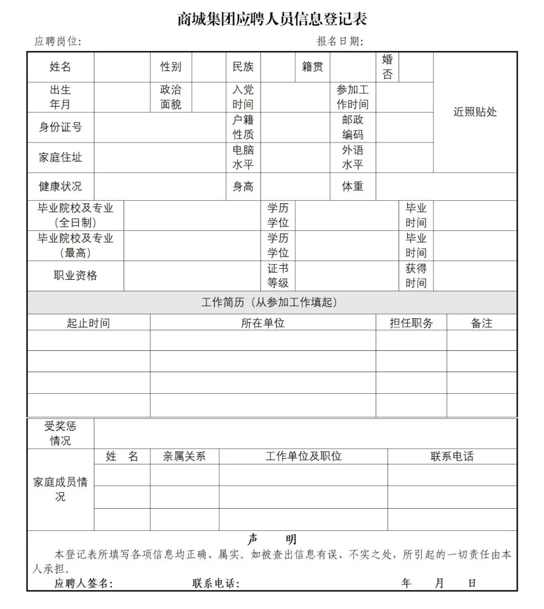 填写附件3:《商城集团应聘人员信息登记表》,并提供以下材料:
