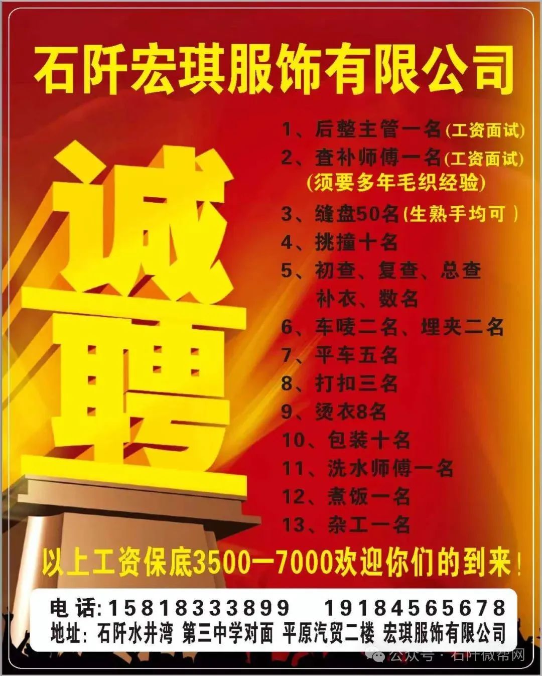 电话:1581833389919184565678地址:石阡水井湾第三中学对面平原汽贸二楼宏琪服饰有限公司