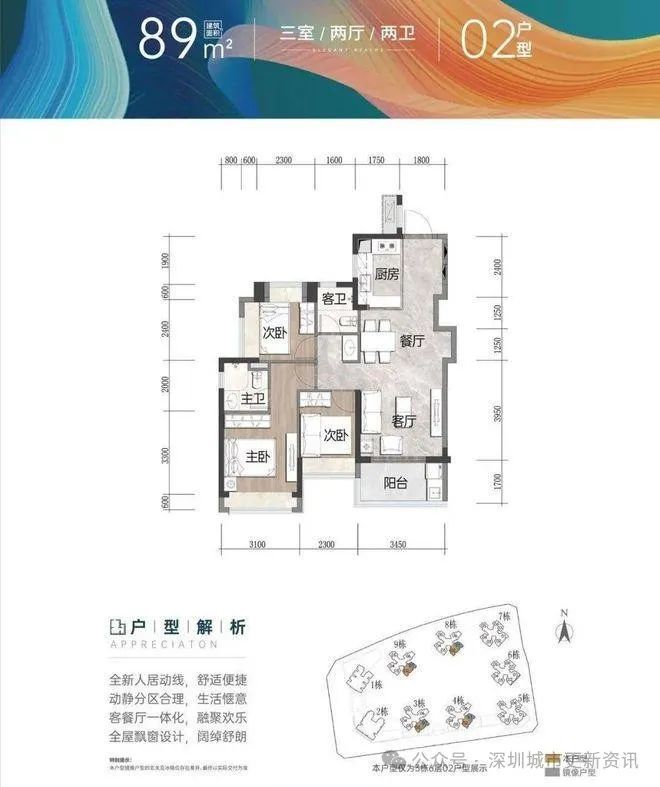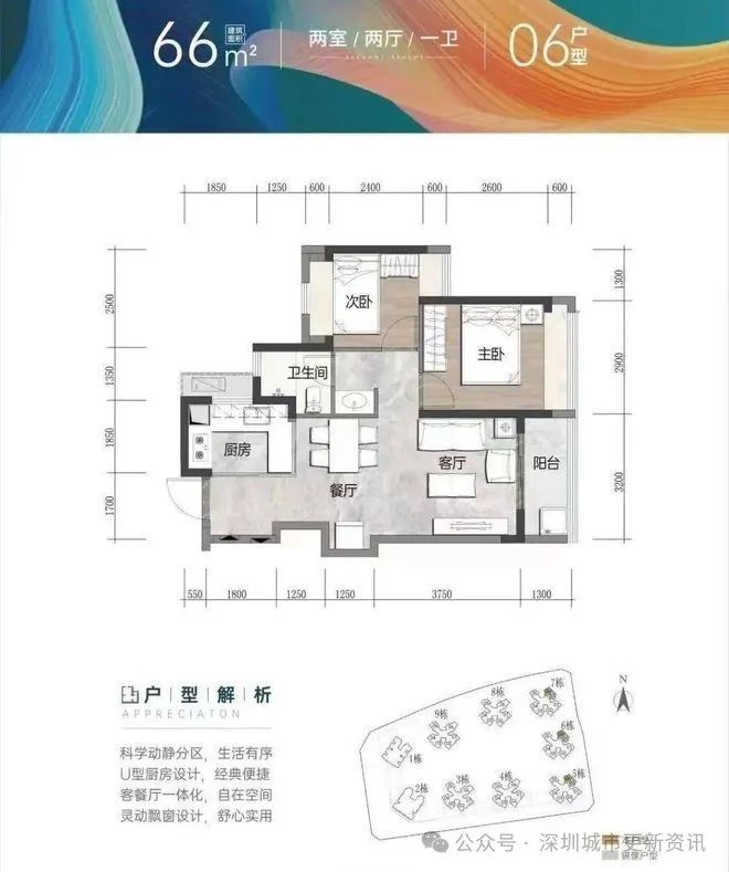 项目目前在售的有66㎡2房1卫、79㎡3房2卫、89㎡3房2和110㎡4房2卫,户型方正,布局科学合理!