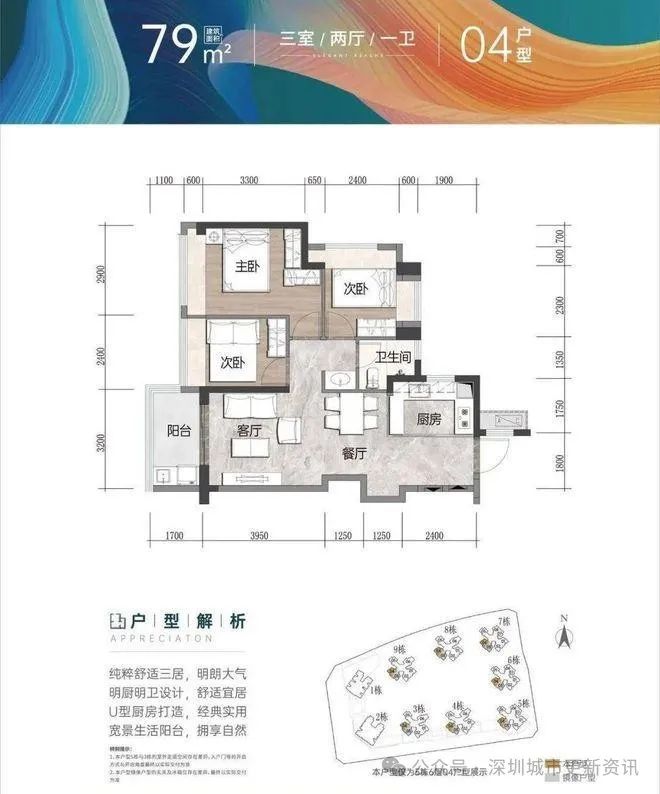 建面约79㎡3房1卫:总价约324-397万