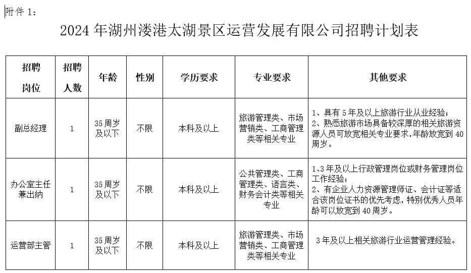 湖州溇港太湖景区运营发展有限公司由湖州太湖溇港文化旅游发展有限公司(湖州织里产业投资运营集团有限公司下属子公司)与织里镇义皋村、伍浦村股份经济合作社合资成立,主要负责太湖溇港4A级景区开发建设及运营管理。根据公司业务发展需要,拟再次向社会公开招聘工作人员,现将有关事项公告如下:详见《2024年湖州溇港太湖景区运营发展有限公司招聘计划表》(附件1)。
