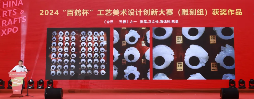 樊军民在介绍“百鹤杯”玉石组参评作品时指出,材料选用、创意设计、工艺技术以及给人带来的艺术感受是评选的关键参考,此次参评作品《仓牙·开极》充分利用了新疆和田羊脂玉的温润细腻特质,将易经的64卦象具象化,作品形神兼备且立意深刻;《江山如画》将满绿翡翠原料就型而做,通过精妙雕刻,营造出大中有小、内有乾坤的艺术效果。他表示,传统工艺美术作品的发展需要古为今用、洋为中用,既要辩证地取舍,也要推陈出新,期望工艺美术行业的从业者能找到自己独特的创作方向,老中青三代艺术家携手合作,共同铸就工艺美术的新辉煌。