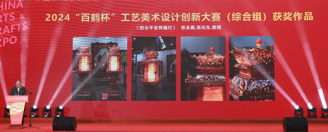 沈国臣在点评“百鹤杯”综合组参评作品时表示,此次大赛各省市踊跃参与,众多能工巧匠和工艺大师的精品力作汇聚一堂,作品在工艺材料、技艺水平和视觉效果上都达到了极高的水准,不同地域文化与民族文化进行多元结合,引领工艺美术行业向更高层次的发展。其中,长30米,高1.2米的《千里江山全卷》运用福州脱胎漆器薄料淡彩的髹饰技艺,层次丰富、色彩沉稳;《四合平安祥福灯》巧妙结合了传统景泰技艺、镶嵌和琉璃等工艺,并融入了语音声控系统,实现了对日用美学的创造性继承;《万壑松泉》将崇山峻岭和青松、流泉完美融合在一幅画面中。《如愿提梁壶》体型饱满、线条简洁多变、细节灵巧生动,展现了当代紫砂的精工细作与抽象艺术的融合。