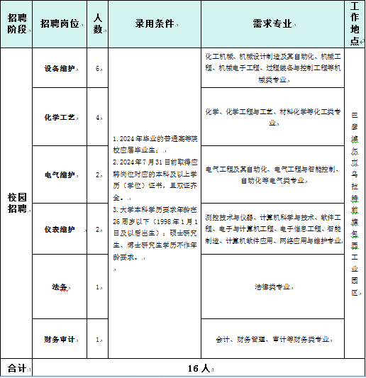 根据公司发展需求,本次计划校园招聘人才16人,具体招聘条件详见《内蒙古包钢庆华煤化工有限公司2024年新员工招聘(校园招聘)岗位需求表》(附件1)。